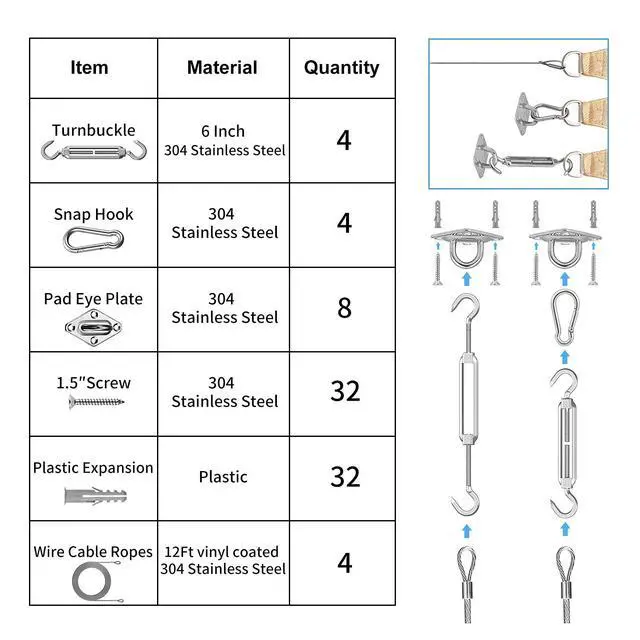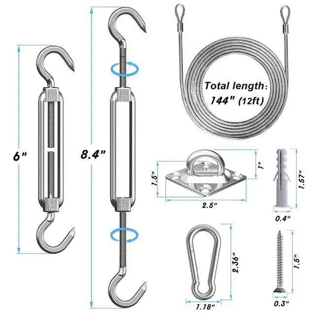 - Our 6-inch/M6 shade sail installation kit is equipped with a 12ft wire rope to fit all your choices.