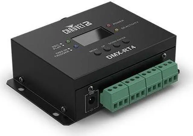 Recording and playing back DMX programming has never been easier than with DMX-RT4. This robust DMX recording and playback device has 4 independent triggers for playback and each trigger can be programmed and activated separately. Normally Open (N/O) or Normally Closed (N/C) triggers allow the use of most common sensors. The USB-C connector lets you copy, backup and transfer show files while a standard 3.5mm headphone jack connects to external audio systems for amplified playback. Keep your creations safe and secure with password protection. DMX-RT4 also supplies DC voltage through terminal block to power specific triggers.