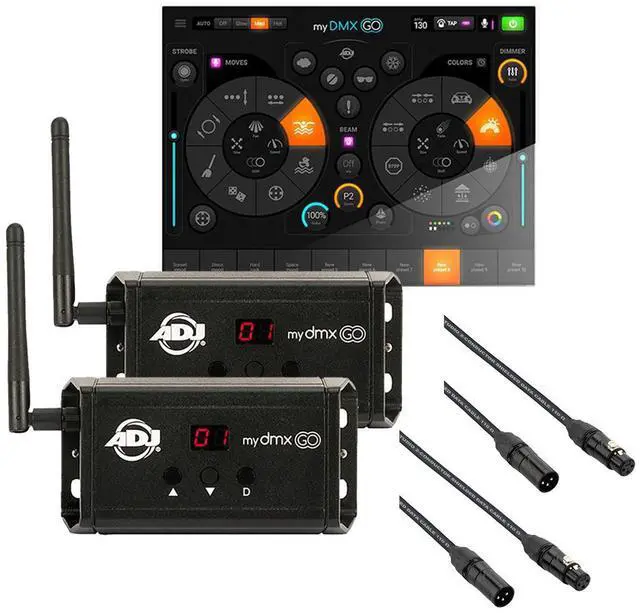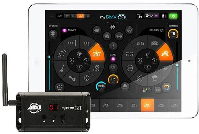 Use your iPad or Android device to take control of your intelligent lighting fixtures with the American DJ myDMX Go Lighting Control System, which is well suited for mobile entertainers, small night clubs, bars, and leisure venues. The powerful, yet simple-to-use software can create stunning synchronized light shows across any combination of fixtures. The distinctive layout of the software app features two FX wheels, one for color chases and one for movement patterns, and contains eight preprogrammed effects. These can be selected independently, customized (by altering the color palette, speed, size, shift, and fan) and combined to create a vast number of different effects, which can then be stored for instant recall to one of 50 user-defined presets. With an extensive 15,000 profiles, the myDMX GO can be used to control all types of DMX lighting from any manufacturer.
