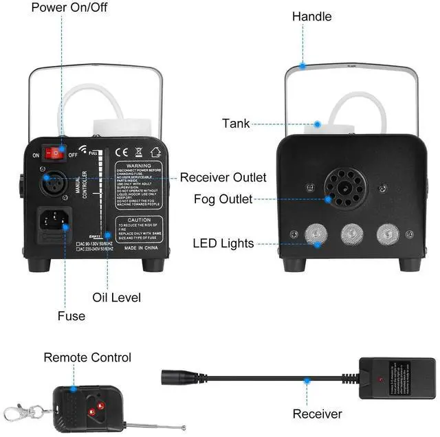 - Non-Toxic & Odorless:The power of fog machine is 400w,the output power reaches around 2000 CFM(c.f./min) and 8.20ft distance. Non-toxic gas is produced and it is safe to use in room.NOTE:This fog machine ONLY works under 100-120V.