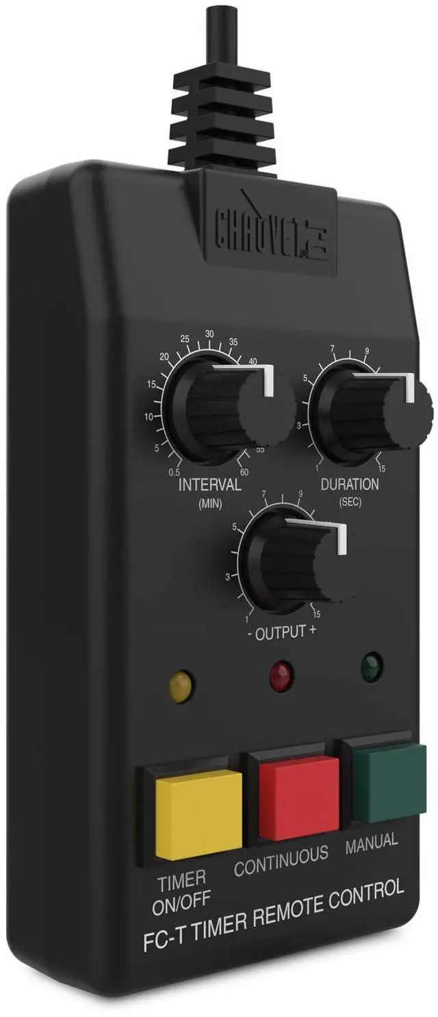 The FC-T is a remote control designed to work with most CHAUVET fog machines. Three LED indicators display timer on/off, continuous fog on/off and whether the machine is ready or heating. Two rotary knobs set interval and duration times.