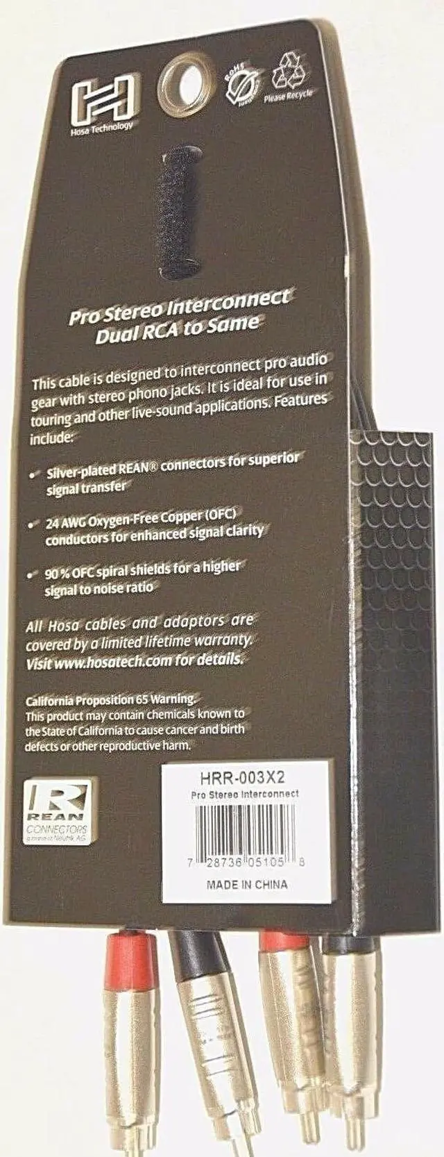 The Hosa 3' Pro Stereo Interconnect (Dual REAN RCA to Same) is designed to interconnect professional audio gear with stereo phono jacks and features silver-plated REAN connectors, 24 AWG oxygen-free copper (OFC) conductors and 90% OFC spiral shields. This premium cable is ideal for use in touring and other live-sound applications.