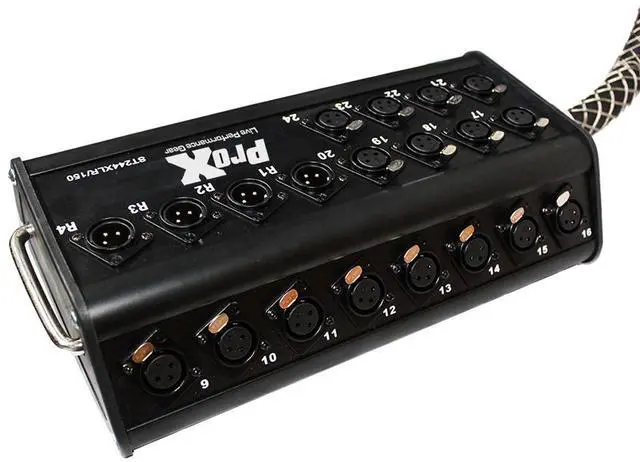 The ProX XC-SB244XLR150 Stage Box is the perfect snake for a medium Sized club or live setting with 16 XLR microphone style cables for vocal and instruments or direct boxes onstage while your mixing board has plenty of distance from the performance. Stage Box Snake, 150ft with 24 Channel Female XLR Inputs, with 4 Return Male XLR returns.