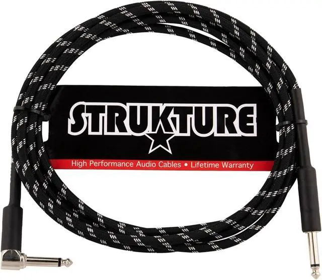 STRUKTURE INSTRUMENT CABLE - VINTAGE BLACK/SILVER, 10FT RIGHT ANGLEThe woven outer covering is reinforced by a state-of-the-art shrink-wrap sleeve to resist separation at the termination points. Finally, we use the highest quality solder connections, which are protected by a thick ABS inner sleeve, to create a cable you can count on.