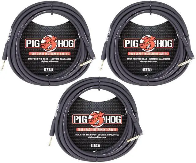 3X PIG HOG TOUR GRADE 18.5FT 1/4" - 1/4" 8MM INSTRUMENT CABLE STRAIGHT TO RIGHT ANGLE CONNECTORSPig Hog 18.5ft 1/4" - 1/4" Right Angle 8mm Inst. CablePig Hog cables are precisely overbuilt to stand up to the most grueling tour conditions imaginable, and are designed to provide the highest quality performance with outstanding value. We understand your cables need to sound great and perform reliably, night after night, without costing you an arm or a leg! Thats why we use an extra-thick, yet supple 8mm jacket that resists kinking or tangling. Our proprietary conductor technology and robust shielding is designed to ensure your sound is crystal clear, without noise or interference, every time. Each cable is hand tested before shipment, and we back up our quality with a lifetime warranty so you can be sure your Pig Hog Cables will be an integral part of your rig for years to come.