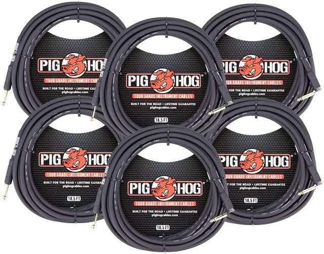 6X PIG HOG TOUR GRADE 18.5FT 1/4" - 1/4" 8MM INSTRUMENT CABLE STRAIGHT TO RIGHT ANGLE CONNECTORSPig Hog 18.5ft 1/4" - 1/4" Right Angle 8mm Instrument CablePig Hog cables are precisely overbuilt to stand up to the most grueling tour conditions imaginable and are designed to provide the highest quality performance with outstanding value. We understand your cables need to sound great and perform reliably, night after night, without costing you an arm or a leg! Thats why we use an extra-thick, yet supple 8mm jacket that resists kinking or tangling. Our proprietary conductor technology and robust shielding is designed to ensure your sound is crystal clear, without noise or interference, every time. Each cable is hand tested before shipment, and we back up our quality with a lifetime warranty so you can be sure your Pig Hog Cables will be an integral part of your rig for years to come.