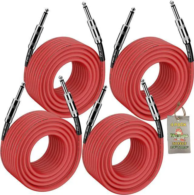 Maximize your audio setup with the Fat Toad (4 Pack) of 50ft 1/4" Jack Speaker Cables, designed to deliver exceptional sound quality over longer distances. These cables are perfect for larger venues or setups that require significant separation between audio equipment. Each cable is equipped with robust 1/4-inch TS connectors, ensuring a secure fit and consistent audio transmission without loss or interference. The 50-foot length provides extraordinary reach, allowing for flexible speaker placement and the ability to traverse large areas without compromising sound quality. The cables are constructed with a durable PVC outer jacket that protects against physical and environmental stress, ensuring they hold up under the harsh conditions of touring and frequent use.