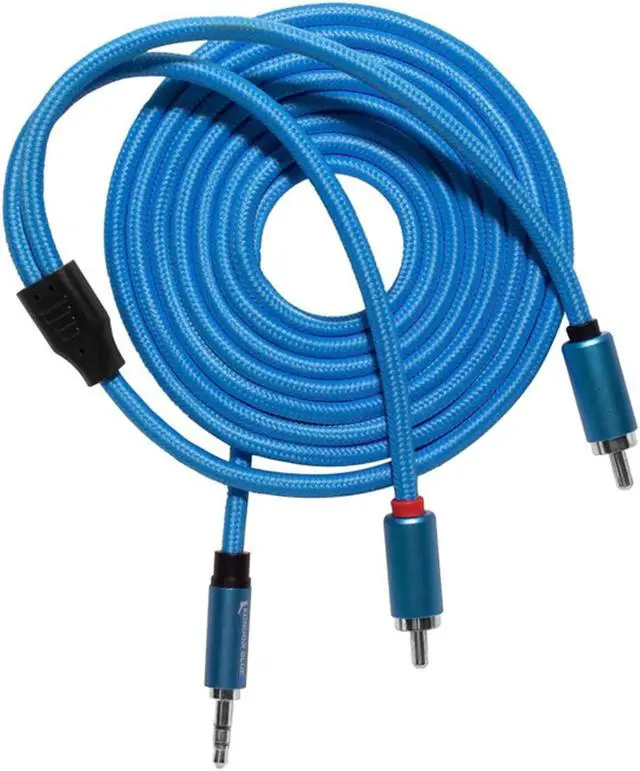 This stylish blue cable is 6 feet long, providing ample length for versatile use. It features a dual male RCA connector on one end and a 3.5mm stereo mini TRS connector on the other, making it ideal for connecting two male RCA devices to a 3.5mm stereo mini TRS audio device.
