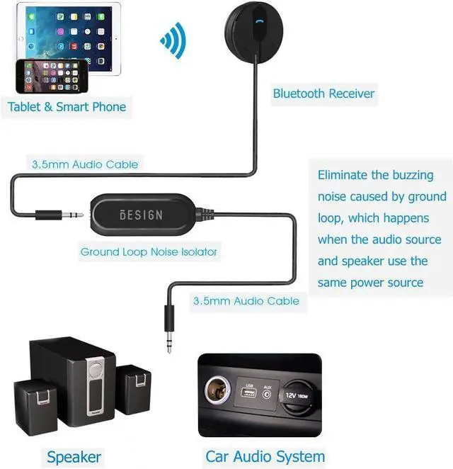 Ground loop filter noise isolator, eliminating the hiss, buzz and interference caused by ground loops which happens when the audio source and the speaker use the same power source in some car speakers / home stereo systems when using the Bluetooth receiver.