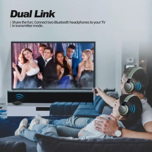 Dual connection, share the fun. Pair two Bluetooth headphones with your TV in Bluetooth transmitter mode, or pair two smartphones/tablet with your home stereo system in Bluetooth receiver mode to stream music.