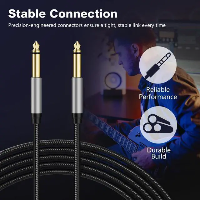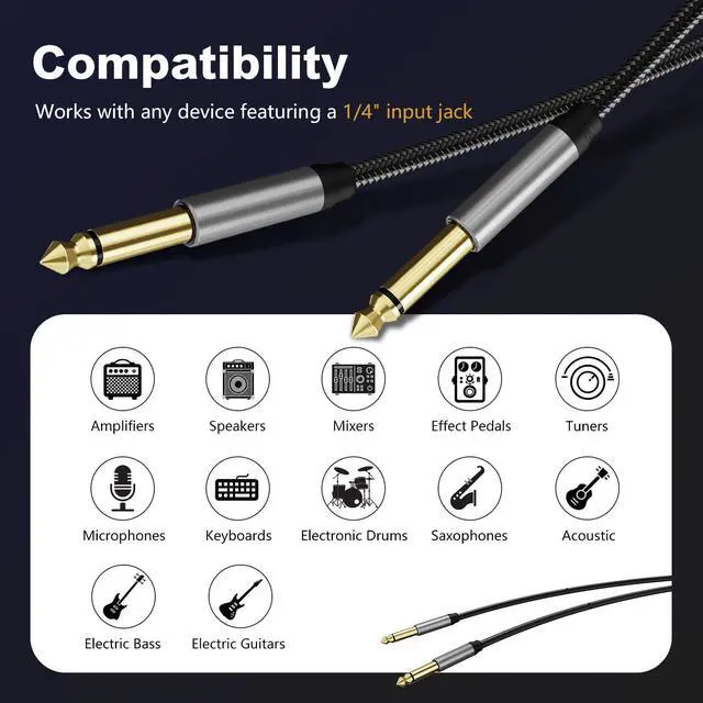 This 6.35mm (1/4") TS guitar cable is fully compatible with all devices equipped with a standard 6.35mm input jack. It supports a full range of musical instruments and audio equipment: electric guitars, electric basses, acoustic guitars, speakers, mixers, effect pedals, tuners, microphones, keyboards, electronic drums, saxophones, and more. Whether you’re practicing at home, recording in the studio, or performing on stage, one cable meets all your connection needs—no extra adapters required, just plug and play for effortless compatibility.
