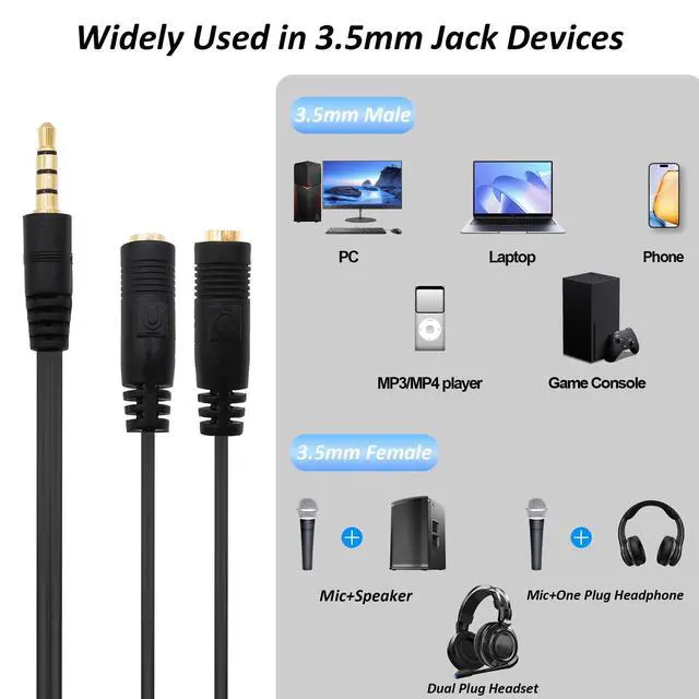 3.5mm TRRS Splitter 1 male to 2 female extension cable is widely compatible with MP3/MP4, PC, mobile phones,Speaker Game Console and other devices with 3.5mm connectors. Connect and expand to headphones, speakers, or home audio systems, etc.