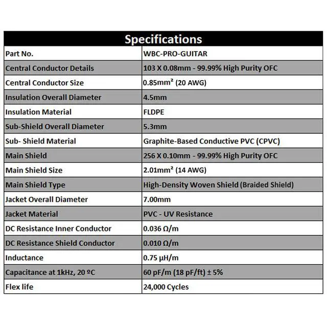 WBC-PRO-GUITAR is the Lowest Capacitance Pro-grade Graphite-based instrument cable in the market & boasts an Ultra-Flexible UV-protected outer jacket