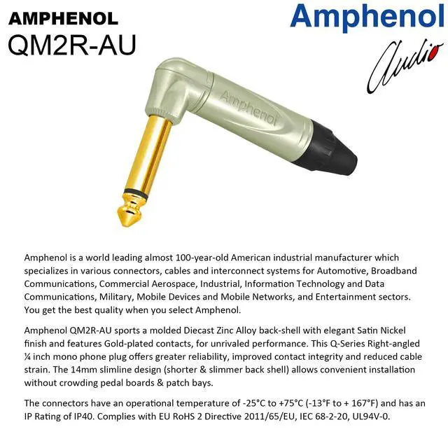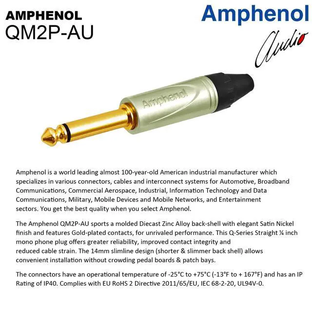 • The brand of connector used for this cable assembly: Amphenol is an almost 100-year-old US company. Their QM2R-AU & QM2P-AU plugs sport molded metal back-shells with elegant Satin finish and feature Gold-plated contacts, for unrivalled performance. This Q-Series Angled & Straight ¼ inch mono phone plugs offer greater reliability, improved contact integrity and reduced cable strain. The slimline design (shorter & slimmer back shell) allows convenient installation without crowding audio equipment.