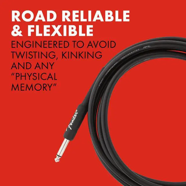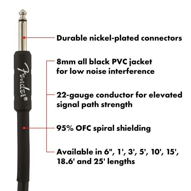 Fender Professional Series Cables are available in 6", 1', 3', 5', 10', 15', 18.6' and 25' lengths.