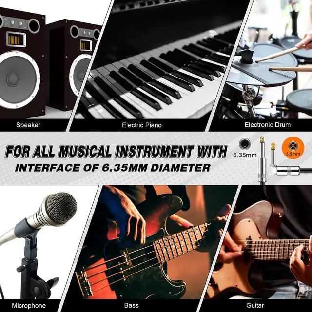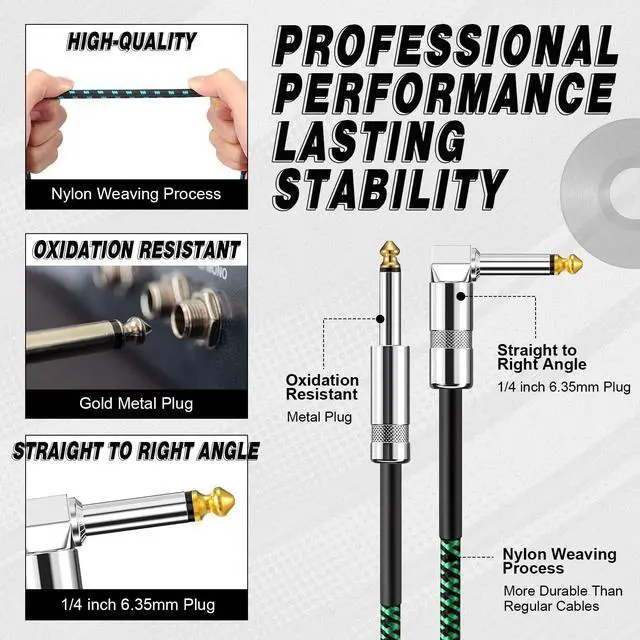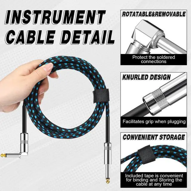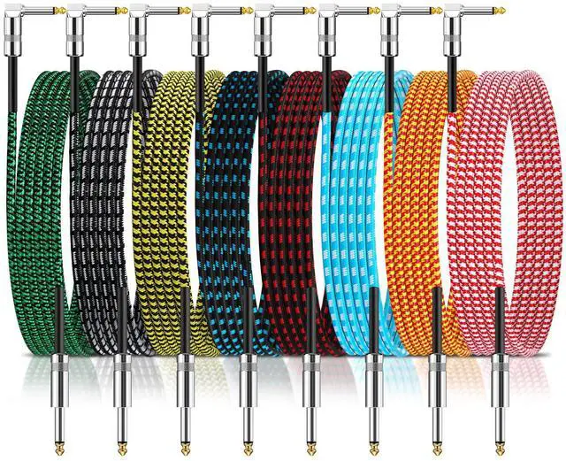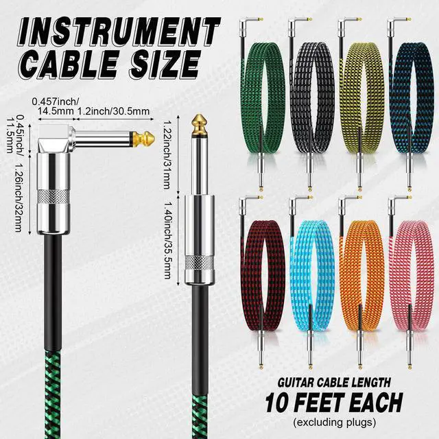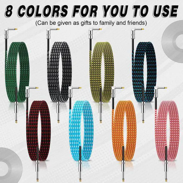 Elevate your music experience with this 8-pack of high-quality guitar instrument cables. Measuring 10 feet in length, these versatile cords are perfect for connecting your electric guitar, bass, keyboard, effects pedals, and microphones. Crafted with durable copper wiring, these electric guitar cable ensure reliable signal transmission and exceptional audio clarity. The multicolored design adds a touch of style to your setup, while the sturdy construction guarantees long-lasting performance. Whether you're jamming at home, rehearsing with your band, or performing live, these guitar cables offer the dependability and convenience you need. Upgrade your gear and enjoy uninterrupted music sessions with this essential accessory pack.