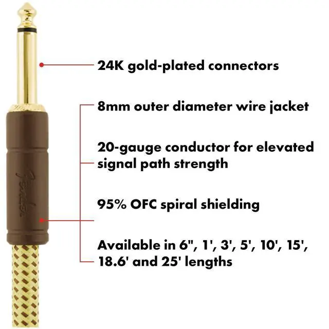 These cables use a very quiet braided shielding that is engineered to maximize the purity of your tone, and they’re protected by a soft-woven yet rugged tweed jacket that provides ultimate protection with classic Fender style.