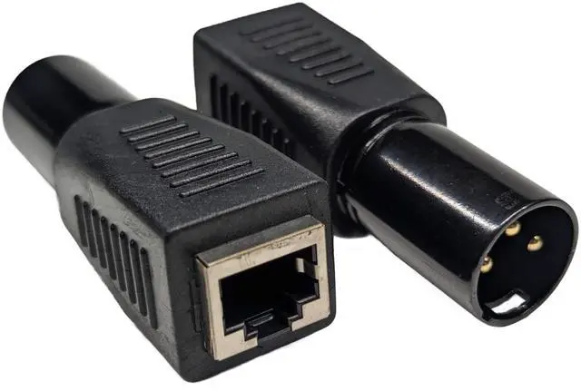 A robust and plug-in adapter made from a rugged molded housing with a nonslip grip that provides male 3-pin XLR to female RJ45 connectors. Simply plug the adapter into the XLR DMX port of a compatible DMX device and use a standard Cat 5 Ethernet cable to create a cost-effective DMX cable.