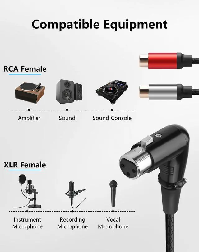 Package Includes: One (1) 90Degrees XLR Female to 2 RCA Female Y-Splitter Adapter, 1 Ft.