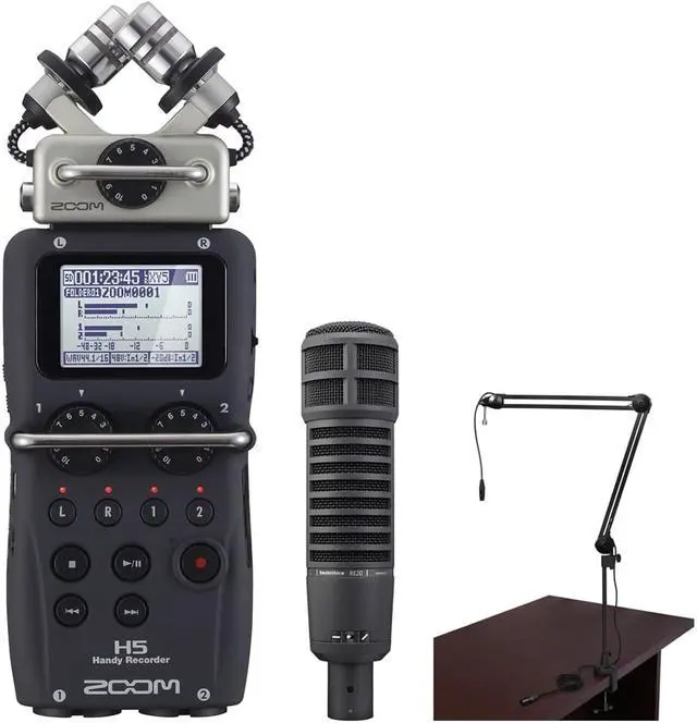 Plus a Two-Section Broadcast Arm with Internal Springs and Integrated XLR Cable. Box Contains Zoom H5 Handy Recorder with Interchangeable Microphone System XYH-5 Microphone Capsule Plastic Case Foam Windscreen USB Cable Two-Section Broadcast Arm with Internal Springs and Integrated XLR Cable Steinberg WaveLab LE Software (Download) Steinberg Cubase LE Software (Download) 2 x AA Batteries 1-Year Warranty Electro-Voice RE20 Broadcast Announcer Microphone with Variable-D (Black) 81715 Stand Adapter 3-Year Warranty