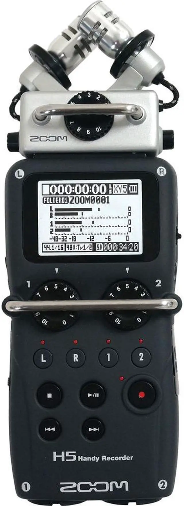 The H5 Handy Bundle from Zoom is a compact, portable handheld digital recorder that is capable of four-track recording and features an interchangeable, modular microphone system. The recorder ships with an XY microphone capsule and is compatible with the existing line of H6 modules including the optional shotgun mic and XLR/TRS input modules. The included XY stereo mic module provides two matched unidirectional condenser microphones set at a 90 degree angle, and features a built-in shockmount system and a maximum SPL of 140dB. Additionally, the recorder is equipped with two inputs for external sources, allowing you to record simultaneously with the included stereo XY mic for a total of four input channels.