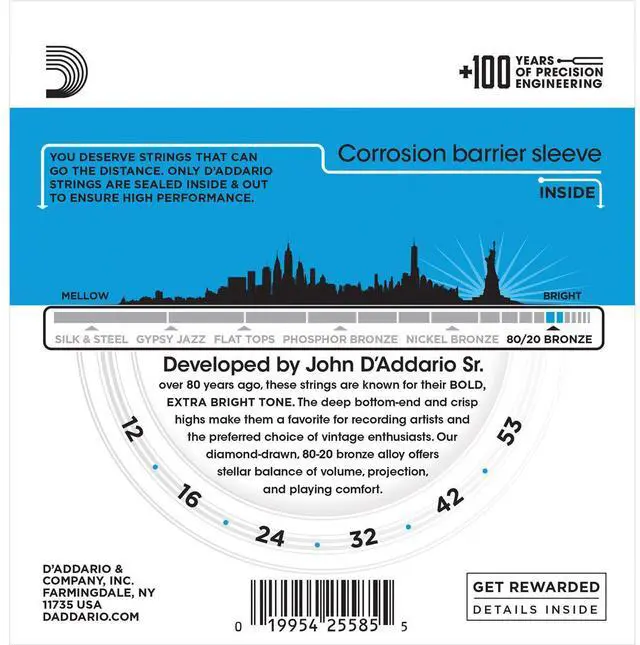 EJ11 is a light gauge 80/20 Bronze set that uses our most popular acoustic guitar string sizes. 80/20 Bronze, the original acoustic alloy introduced by John D'Addario Sr. and John D'Angelico in the 1930s is a popular alloy for recording due to their crisp, deep & projecting tone and appeal to many traditionalists and vintage enthusiasts for their historical significance. A Historic Sound80/20 Bronze is the original acoustic string alloy co-created by John D'Addario Sr. and John D'Angelico in the 1930s. 80/20 Bronze strings are popular for recording due to their bright, crisp, deep and projecting tone and appeal to many traditionalists and vintage enthusiasts for their historical significance.