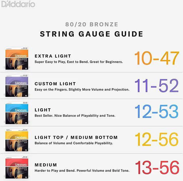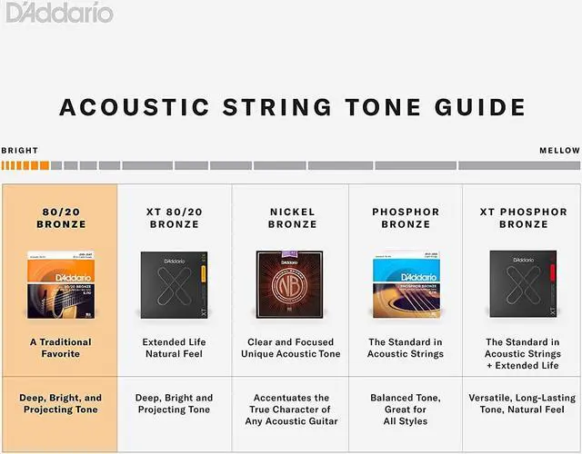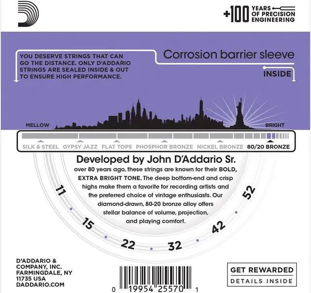 Its historical significance also makes it a popular choice among traditionalists and vintage enthusiasts. Our 80/20 Bronze strings are wound to perfection using state-of-the-art string winding technology, designed and built by D'Addario's expert engineering team. This advanced technology ensures the production of 500, 000 to 700, 000 strings per day, all with exceptional accuracy and consistency. The EJ13 set also features D'Addario's innovative hex core construction. This precision drawn hexagonal core allows the wrap wire to grip the core tightly, resulting in superior dimensional stability, enhanced durability, and precise intonation.