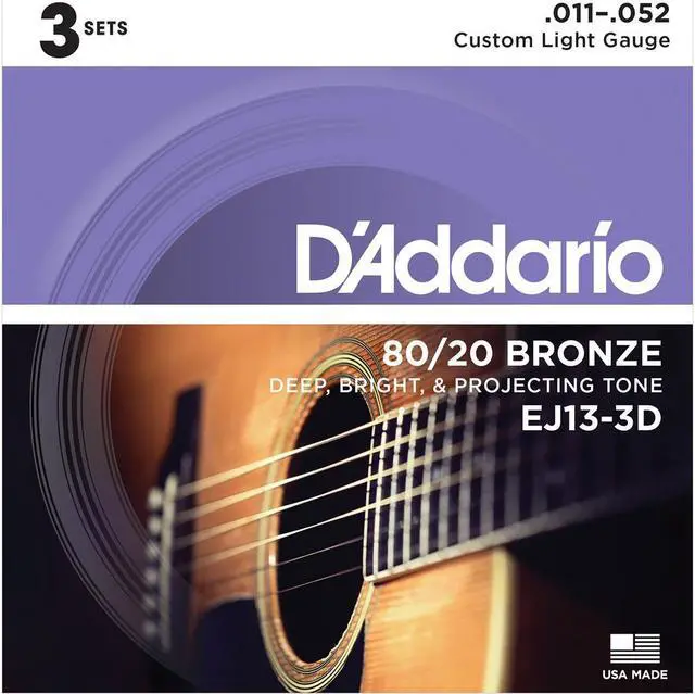 Enhance your acoustic guitar performance with the EJ13 80/20 Bronze Acoustic Guitar Strings Set, Custom Light, 11-52 Gauge, 3-Pack. This set features a custom light gauge with lighter top and bottom strings, specifically designed to offer ease of playability and balance. The EJ13 set is crafted from 80/20 Bronze, a unique acoustic alloy that was first introduced by industry pioneers John D'Addario Sr. and John D'Angelico in the 1930s. This alloy is renowned for its ability to produce a crisp, deep, and projecting tone, making it a favorite choice for recording artists.