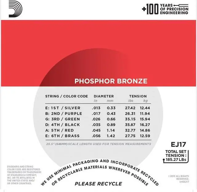 For musicians seeking a robust, well-balanced acoustic tone, the EJ17 Phosphor Bronze Acoustic Guitar Strings Set is an excellent choice. This medium gauge set, ranging from 13-56, offers heavier gauges for amplified volume and projection, making it an ideal choice for musicians who prefer drop or altered tunings. Since their introduction in 1974, D'Addario's Phosphor Bronze guitar strings have become a hallmark of warm, balanced acoustic sound. These strings are precision-wound with corrosion-resistant phosphor bronze onto a meticulously drawn, hexagonally shaped, high carbon steel core. This unique construction results in a long-lasting, bright sounding tone with exceptional intonation, perfect for a wide range of musical styles.