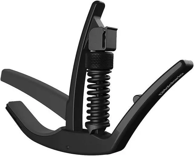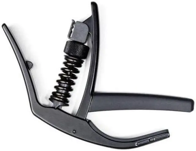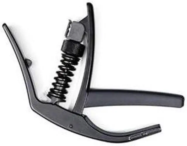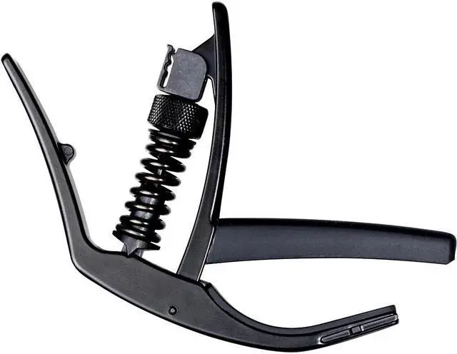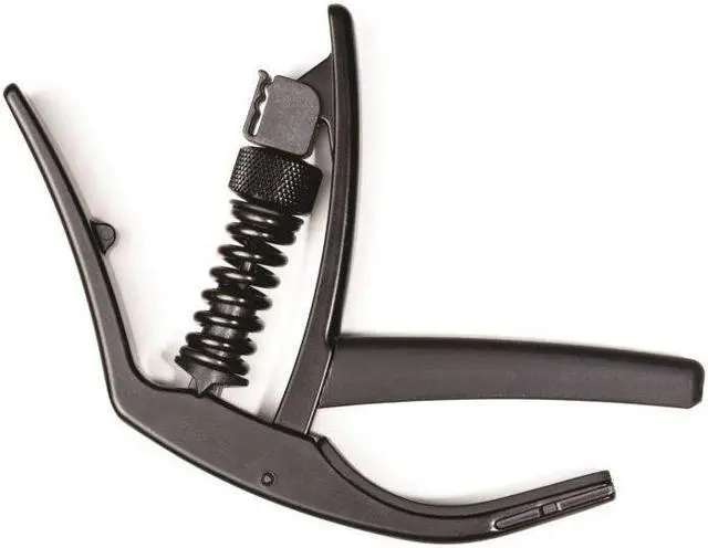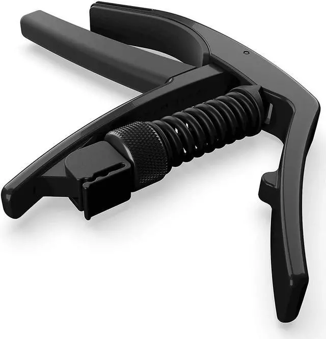 Take your guitar playing to the next level with the stylish and durable Artist Capo with Adjustable Tension in sleek black. This innovative capo, designed by the reputable brand D'Addario, features a patented Tri-Action geometry that significantly reduces the force needed to open and close the capo. This unique design ensures even tension across all strings, regardless of the guitar's neck profile, for a seamless and in-tune performance at every fret. The Artist Capo stands out with its micrometer tension adjustment feature, which allows for precise tuning and direct horizontal pressure.