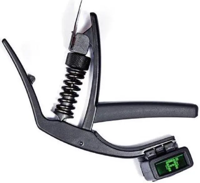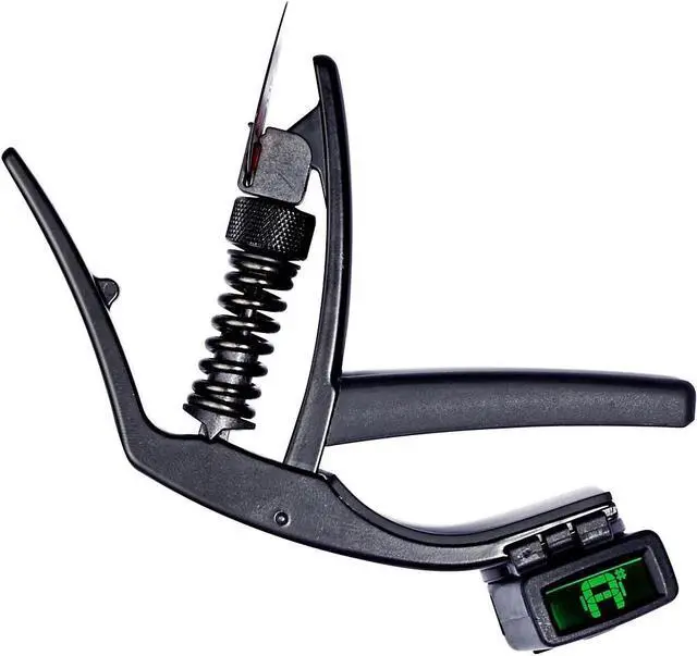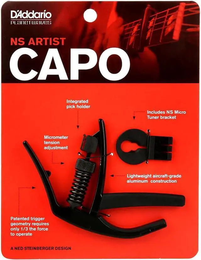 This eliminates the common issue of strings being pulled side to side, removing the need for constant retuning during use. Its compact and lightweight aluminum construction ensures no obstruction or noticeable weight is added to your instrument, allowing for comfortable and uninterrupted play. This easy-to-use capo also includes a pick holder bracket and a micro tuner mounting bracket, offering the option to add tuning capabilities directly to the capo for enhanced convenience (tuner sold separately). This product is a result of a collaborative design effort with Ned Steinberger, a renowned innovator in the music industry, and holds US Patent 8, 779, 262.