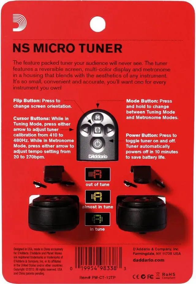 When precision and convenience are paramount, the D'Addario NS Micro Chromatic Headstock Clip-On Tuner is the perfect companion for your musical instruments. This compact, high-quality tuner is designed to blend seamlessly with the aesthetics of any instrument, making it virtually invisible to your audience. The tuner boasts a vibrant, full-color display with four selectable viewing angles - two vertical and two horizontal - ensuring optimal visibility and flexibility for any playing situation. Its advanced tuning algorithms enable accurate tuning even in noisy environments, making it an ideal choice for both practice sessions and live performances.