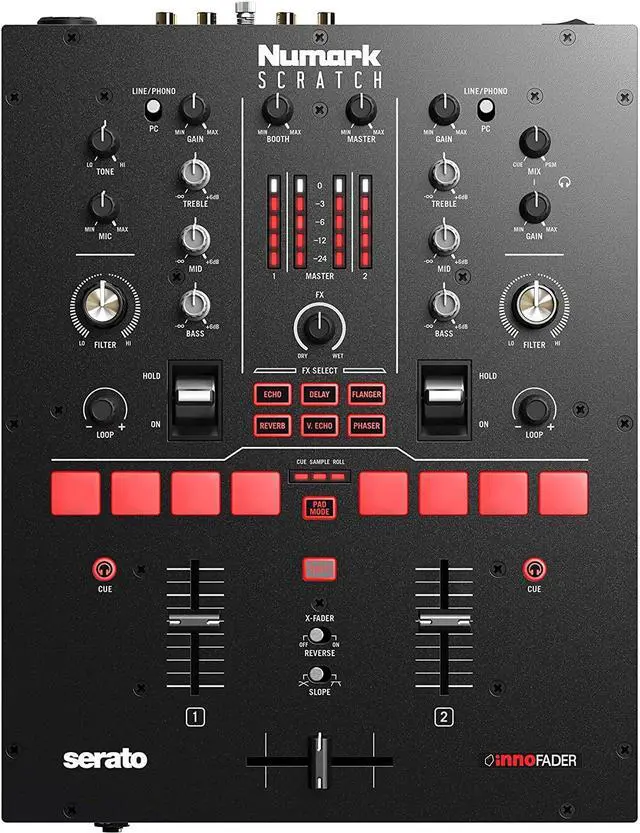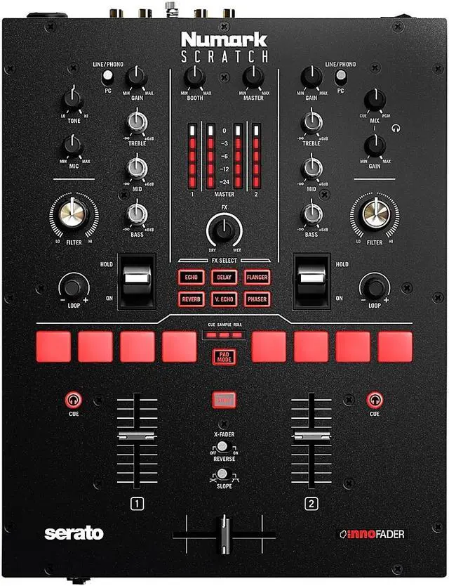 Numark Scratch is a feature-packed 2-channel DJ mixer built specifically for scratch DJs, turntablists, and performance-driven mixing. With premium audio components, pro-level FX controls, and plug-and-play Serato DJ Pro and DVS integration, it delivers high-end features in a rugged, affordable package. Numark Scratch Competitive Differences