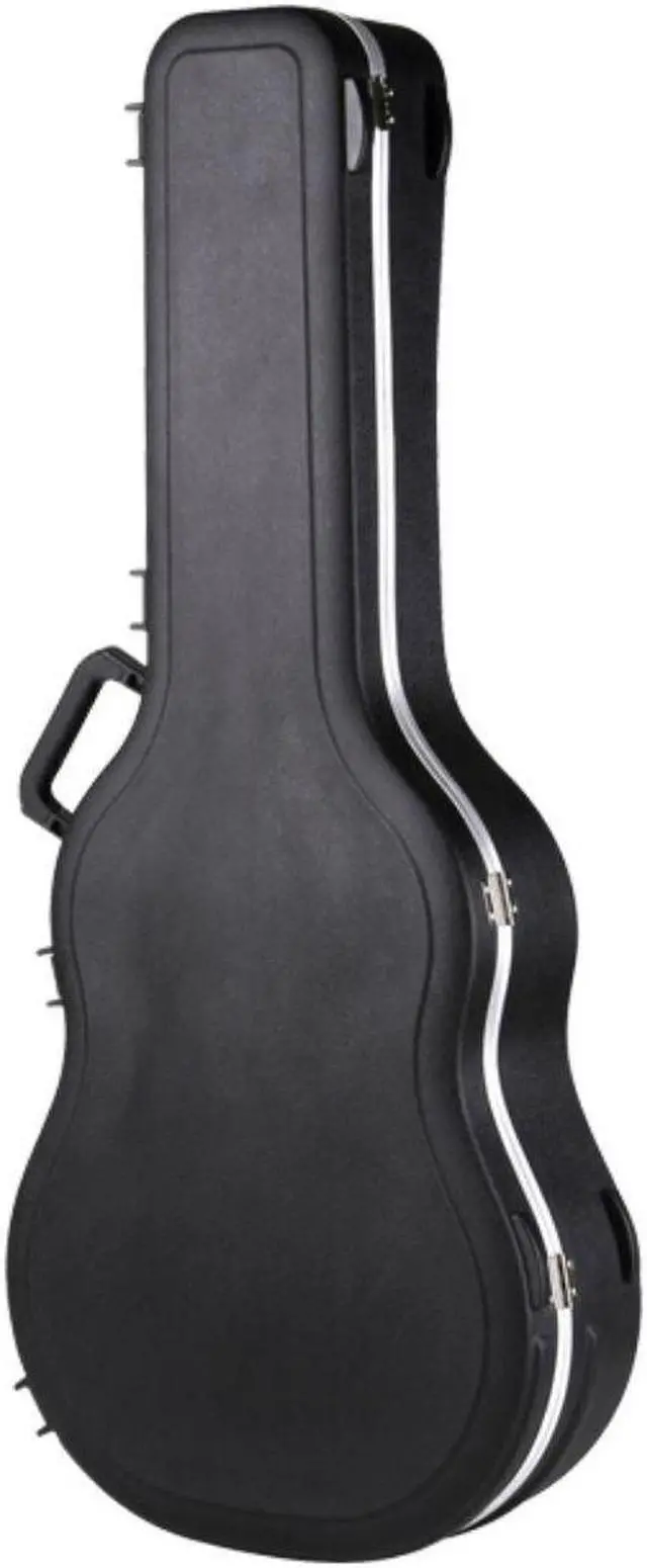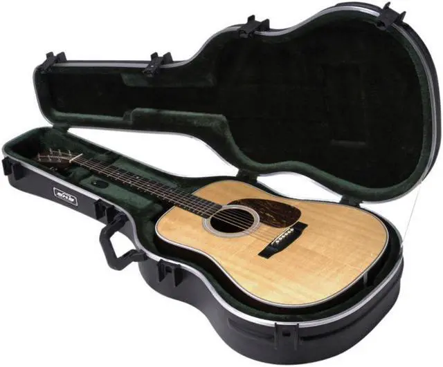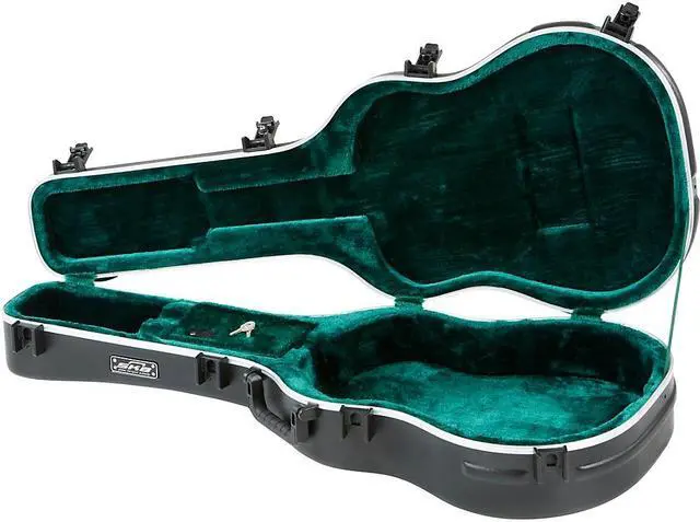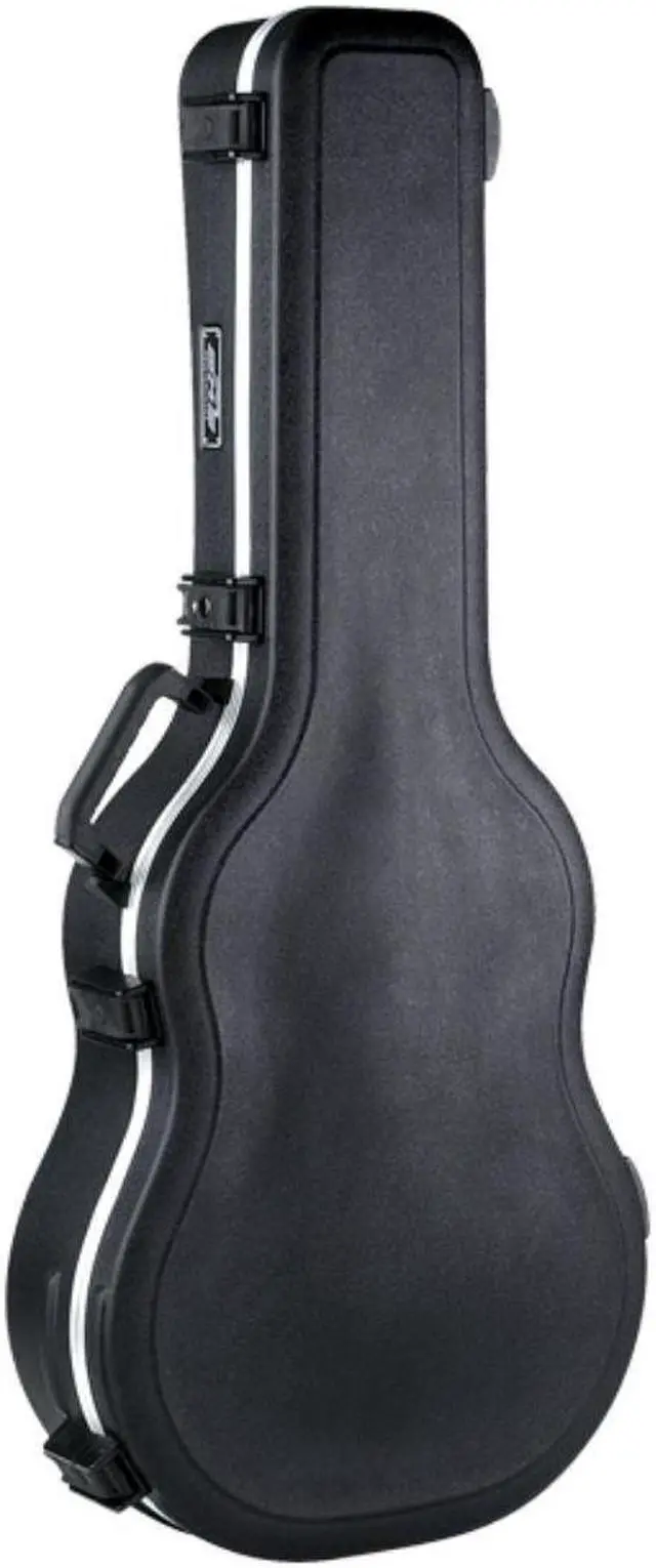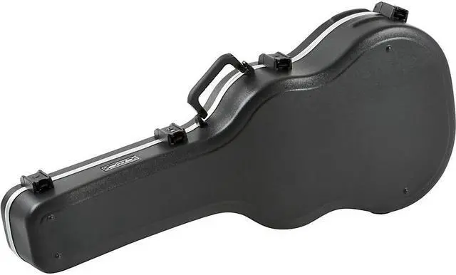 This SKB Deluxe Universal dreadnought case fits dreadnought and 12-string guitars, and features a contoured arched lid that will fit knobs on electric models. Designed with fiberglass reinforced nylon trigger release latches as well as a TSA-accepted locking latch and a comfortable, cushioned rubber over-molded handle. Molded-in bumpers provide valance protection. This SKB Deluxe Universal dreadnought case protects your guitar with a deluxe heavy-duty plush interior.