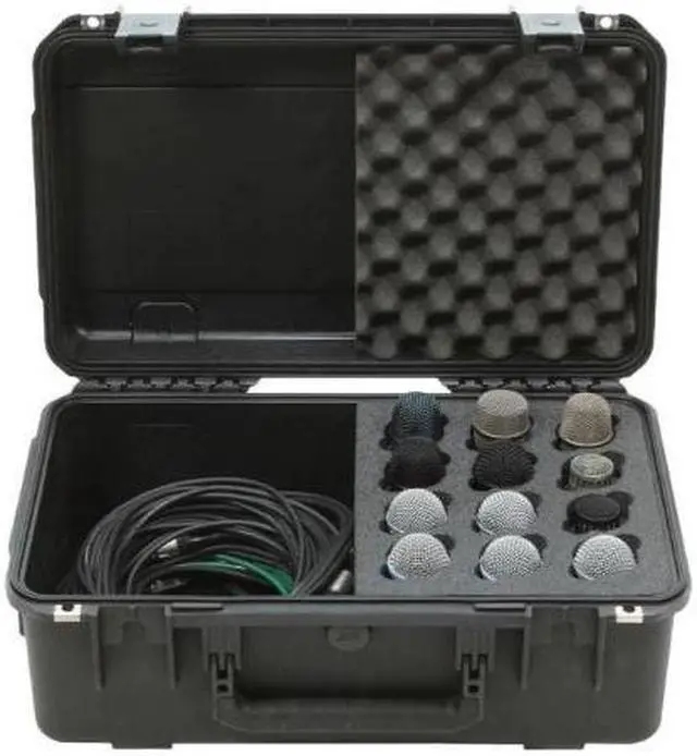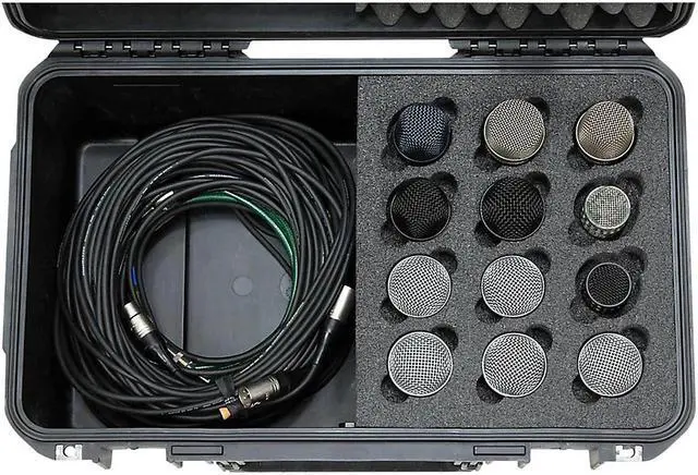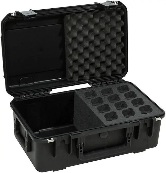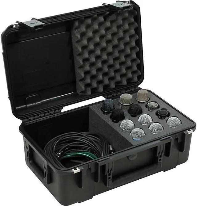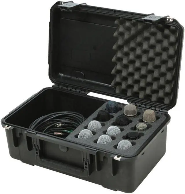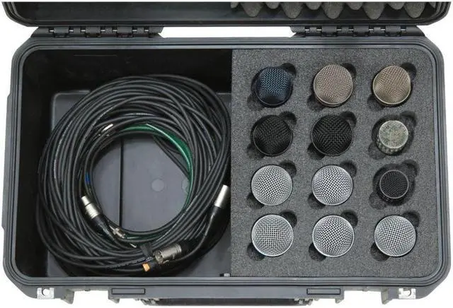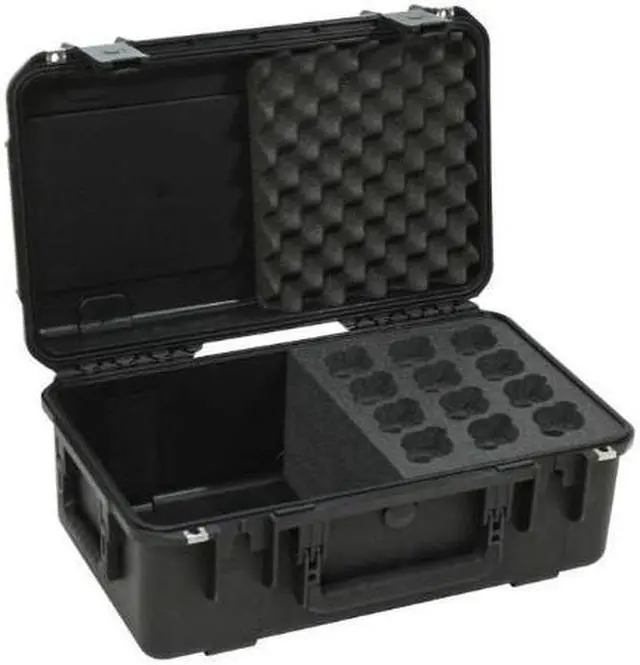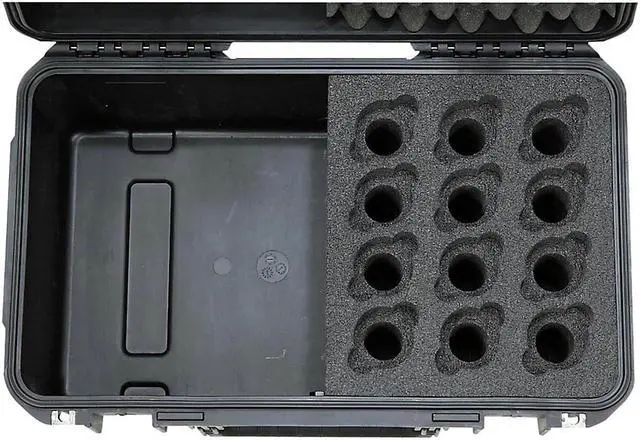 The 3I-2011-MC12 microphone case holds 12 microphones stored vertically and is part of the iSeries waterproof case line. The microphone holes are designed to secure most popular types of handheld microphones, finger cutouts that provide instant access and a generous storage compartment for cables and microphone clips. The interior is made of high-quality PE foam designed to last. The 3I-2011-MC12 microphone case measures 20"x11"x8" deep and is covered by SKB's Unconditional Lifetime Guaranty. 3i Series injection-molded waterproof cases are constructed of ultrahigh-strength polypropylene copolymer resin and feature a gasketed, waterproof and airtight, submersible design (IP67) that is resistant to corrosion and impact damage.