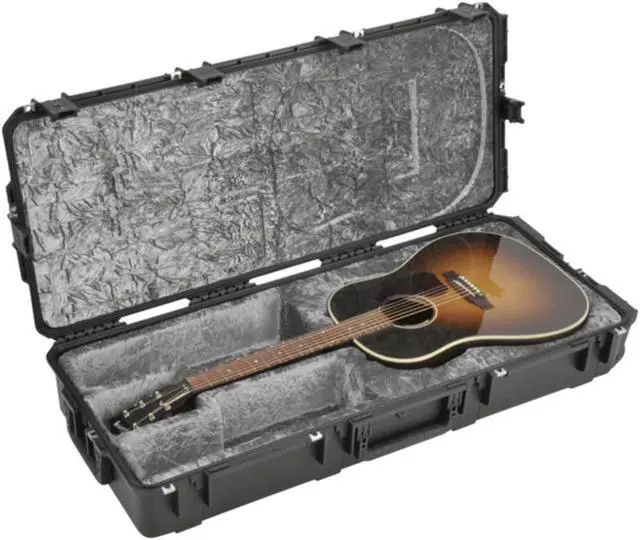 The SKB iSeries Waterproof Acoustic Guitar Case is constructed of ultra high-strength polypropylene copolymer resin and features a gasketed, waterproof, submersible design that is resistant to corrosion and impact damage. The 3I-4217-18 accommodates most Dreadnought guitars. The guitar case features molded-in hinges, patented -inchestrigger release-inches latch system with TSA recognized and accepted locks. Additionally, four reinforced locking loops for customer supplied locks, comfortable, snap-down rubber over-molded cushion grip handles, secure stacking, and automatic ambient pressure equalization valve all contribute to its military grade design. The platinum plush interior provides total neck support and protection on all sides. The case also features quiet-glide wheels and a convenient large accessory compartment.