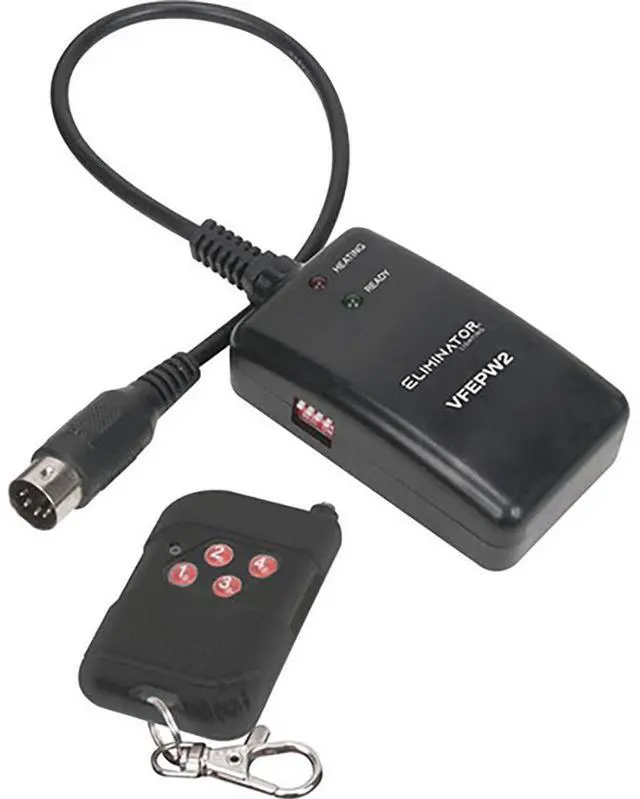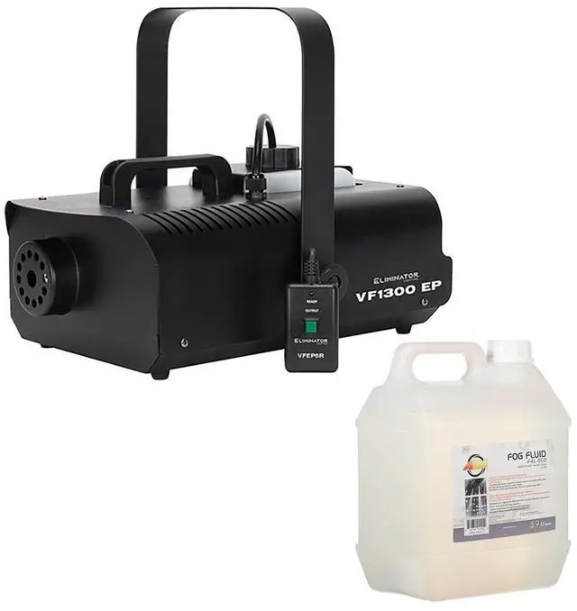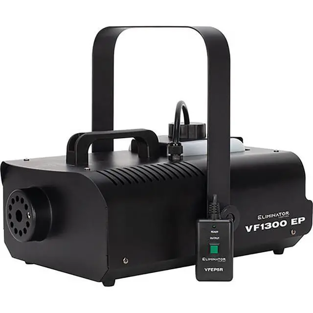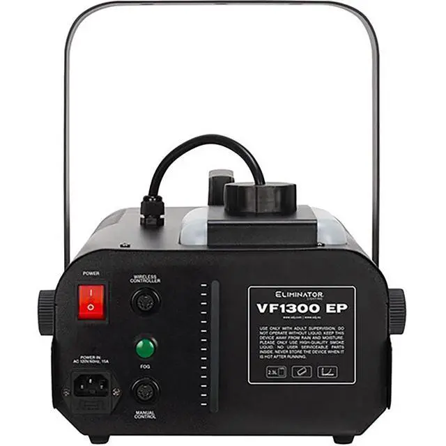Elevate your event's ambiance with the Eliminator Lighting VF1300 EP, a mobile fog machine that adds a theatrical atmosphere to traveling shows, film and video productions, parties, nightclubs, concerts, and other entertainment venues. The VF1300 EP has an efficient heater with a 3-minute warm-up period and a 0.6-gallon external fog fluid tank with a low fuel shutdown function and Electronic Thermo Sensing (ETS) for safety and optimum heating levels. The unit outputs 12,000 ft³ per minute and has a convenient rear panel fog switch. The VF1300 comes with a wired remote control and a wireless remote control. An optional timer remote control is available separately.