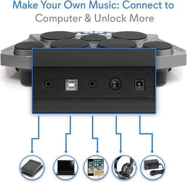 - CONNECT TO MAC AND PC: connect the table drum to your computer using a USB cable to act as a MIDI Connection for your favorite desktop software. it also has an AUX in jack for connecting other devices and a phone out jack for amplifiers of headphone