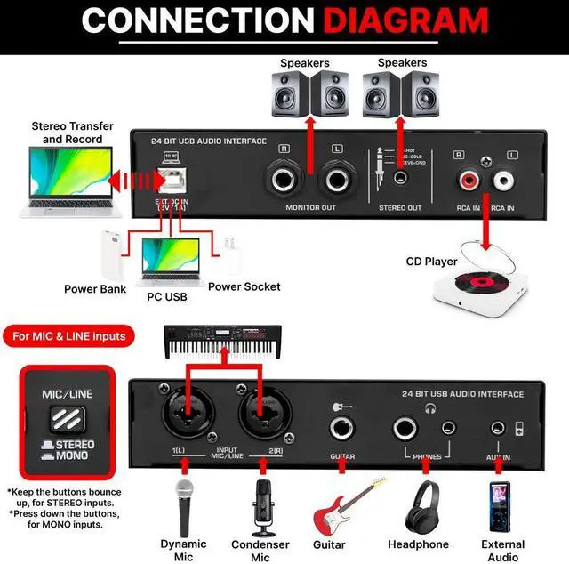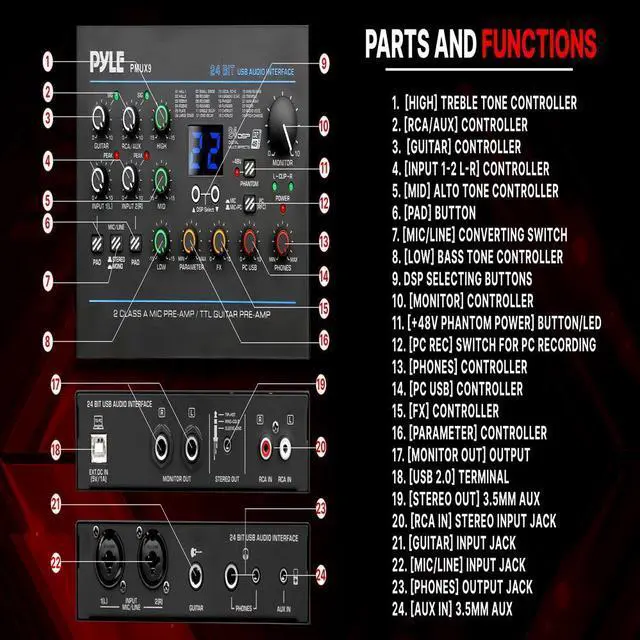 The Pyle PMUX9 Professional USB Audio Interface is an ideal tool for musicians, podcasters, and content creators. With 24-bit, 48kHz resolution, this interface provides pristine, high-quality recording that is perfect for vocals, guitar, or any audio source. It features multiple inputs, including mic, line, guitar, and RCA, and offers two headphone outputs for monitoring in different environments. The interface also has built-in digital effects and is powered by a USB or 5V power supply, making it portable and easy to use in a variety of settings.