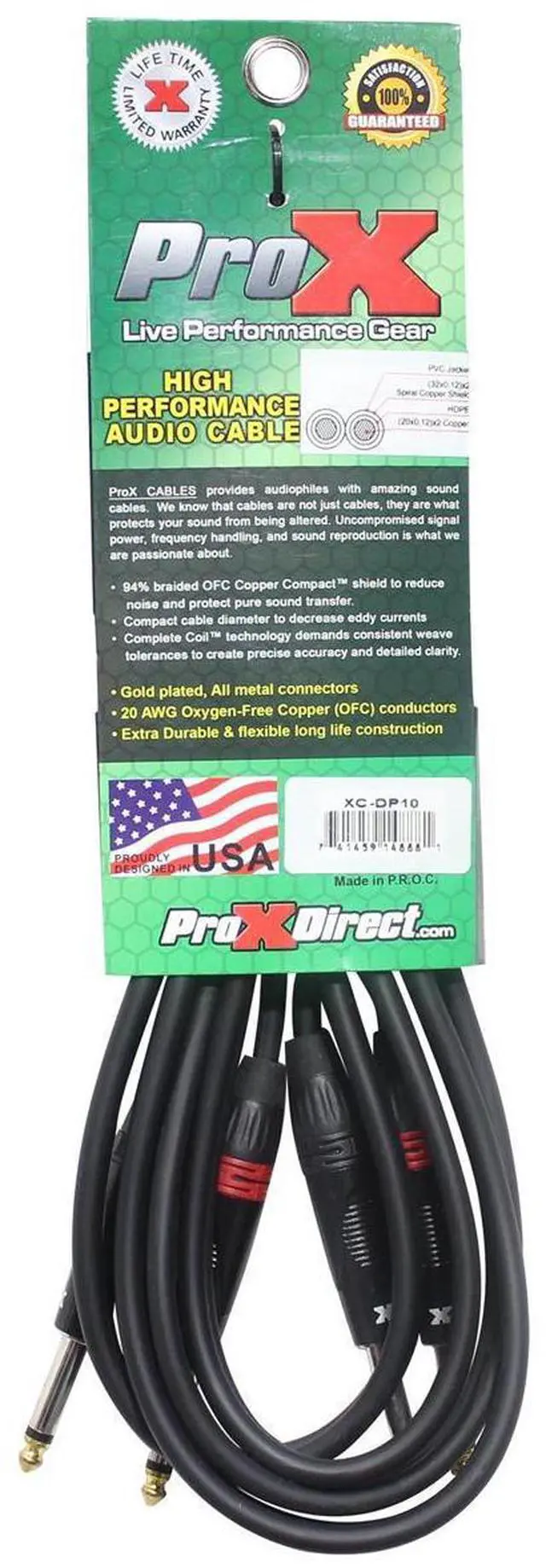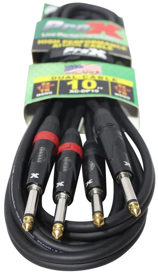 ProX strongXC-DP10 strong10 Ft. High Performance strongDual 14 TSstrong strongMale strongto strongDual 14 TS Malestrong Unbalanced Audio CableProX Live Performance Gear Cables are made to last you an entire lifetime. Each cable is made with high-quality materials and delivers a clear signal and connection each time. These cables are made by professionals for professionals like you. Each cable is built for High Performance and to withstand heavy everyday use. strongCable Type:strong Dual Cablebr strongConnector 1: strongDual 14" TS Malebr strongConnector 2:strong Dual 14" TS Malebr strongSpecification:strong UnbalancedstrongThe Build:strongbr Our cables are plated with gold and silver connectors for superior signal transfer. 93% Braided Oxygen-Free Copper (OFC) Conductors which provide an optimum signal transfer.strongQuality Control:strongbr We test every single cable to make sure each one performs to the best of its ability, which includes high performance and flex