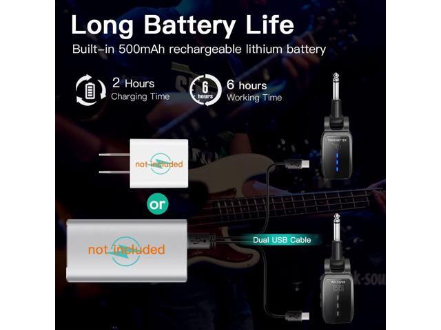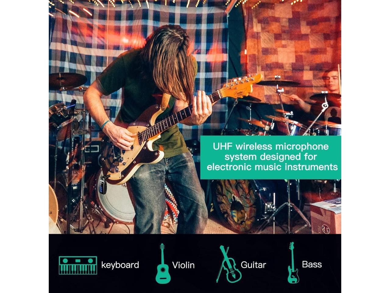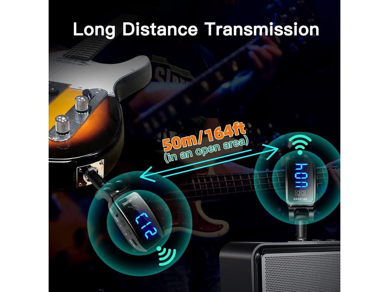 - Wireless Guitar System: The wireless guitar transmitter receiver utilizes Latest UHF technology that delivers great audio quality and stable signal.The max transmission range is 164ft/50m(in an open area)