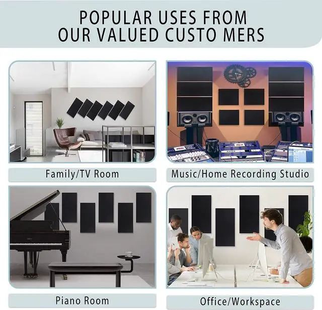 WIDELY APPLIEDThe professional sound dampening panels, you can make other sounds much clearer, it can be used for professional studios, rehearsal rooms, concert halls, podcasting, churches, home theaters, vocal booths, home studios, offices.