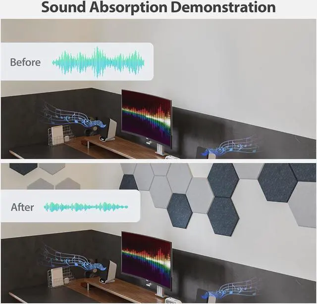 FASHIONABLE HEXAGONAL DESIGNOur sound-absorbing panel adopts a hexagonal honeycomb design. The hexagonal shape can achieve a wide range of sound-absorbing and noise-reducing effects. At the same time, you can use the sound-absorbing panel for fashionable Design, sound-absorbing panels in various colors, let you match the design