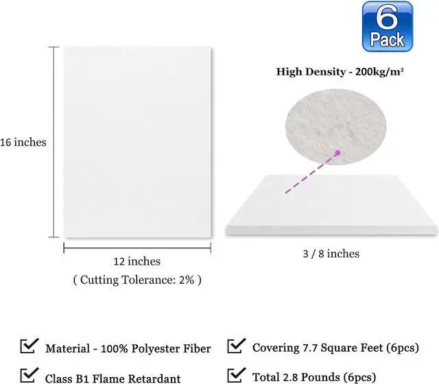 X 3/8 inches(cutting tolerance: 2%), pack of 6, covering 7.7 square feet; Weight - 2.8 pounds of 6 pieces; Material - Polyester Fiber