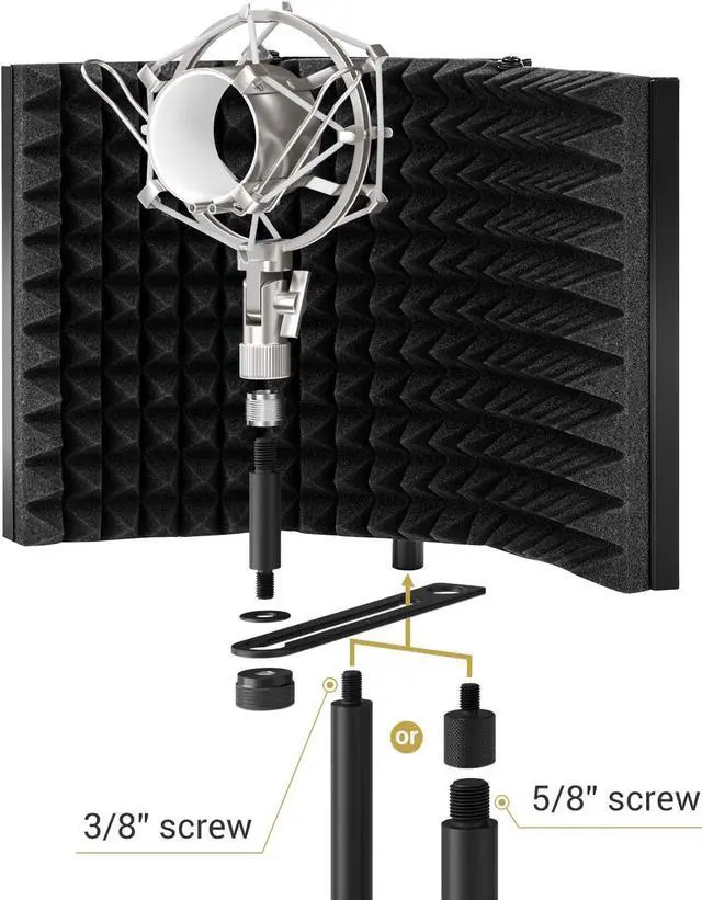 Versatility: The microphone isolation shield can be fixed on a desk or tabletop, and also can be mounted to a microphone stand. Great for professional vocal/acoustic recording and podcasting sound booth.