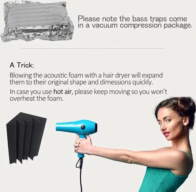 Please note our bass traps come in a compressed vacuum package. After unpacking the package, put the bass trap foam in a ventilated place for about 24 hours and they will recover to the normal size. Some customers soak the foam in water, wring them out, and blow them dry with a hairdryer. By doing so, these bass trap acoustic foams can quickly regain their shape.