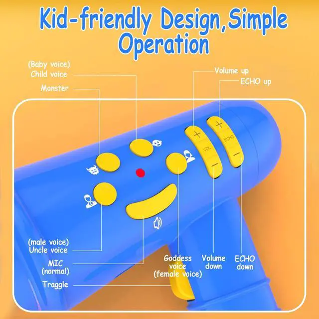 Fun & Interactive Voice ChangerTransform voices into fun sounds Monster, baby,uncle,goddess,Mic sound with adjustable sound level and ECHO.perfect for imaginative play,creative roleplay,pranks,and outdoor adventures,creating unforgettable playtime.