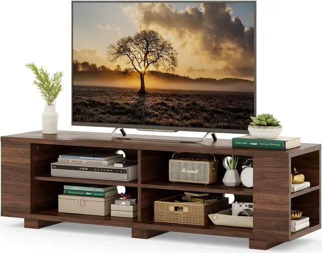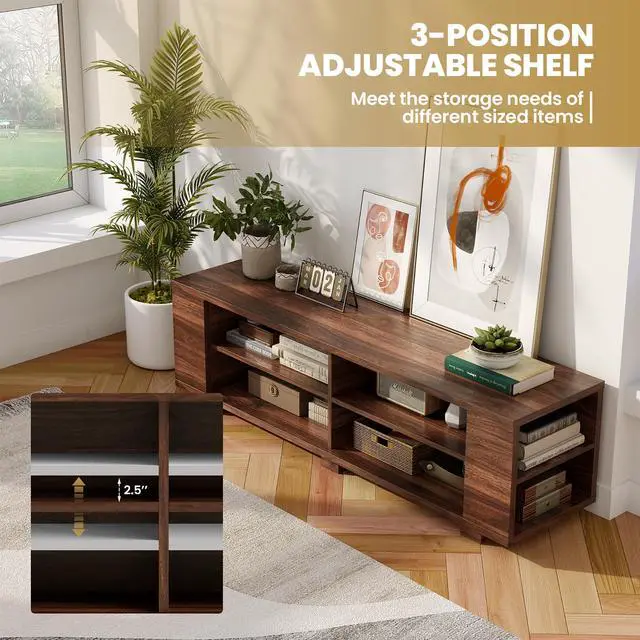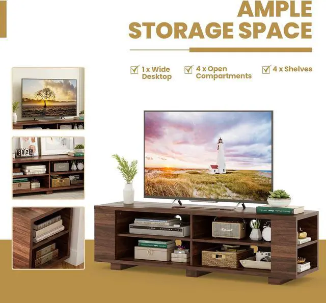 If you need a beautiful and sturdy TV stand, don't miss out on our new product. This TV stand is made of MDF veneer, which has a firm structure and strong load-bearing capacity. You can put things like TV, vases and photo frames on it. The most important thing is that it has a large capacity of open storage space. Eight cabinets allow you to put a lot of things, which saves you a lot of space. It has four threading holes on the back that allow wires from TV set-top boxes, DVD players, game consoles and stereos to pass through easily and orderly. And it's easy to clean and assemble, saving you a lot of time.