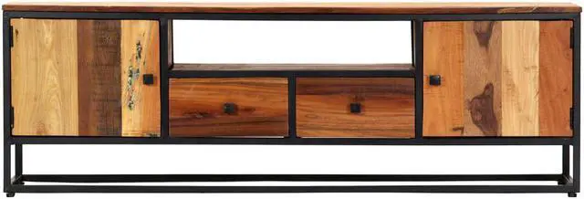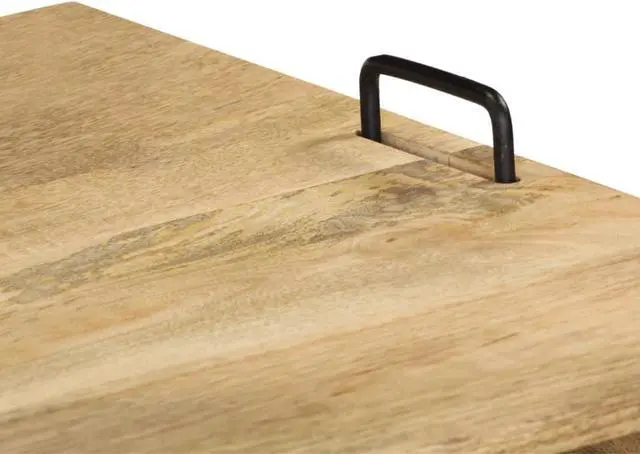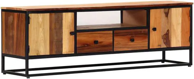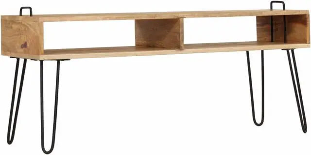 The wooden TV stand will make a timeless addition to your living room decor. Constructed from solid mango wood and sturdy steel frames, the HiFi cabinet is highly stable and durable. The top is ideal for placing your TV or stereo systems as well as some decorative items like vases and potted plants. The shelf provides extra storage space for keeping your DVD players, game consoles, streaming devices, media carriers, etc. neatly organized. The steel frames add to the stand's sturdiness as well as to its industrial style. Every step of the construction process is carried out with the greatest care, be it polishing and lacquering.