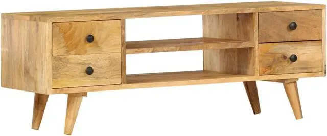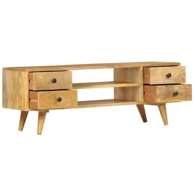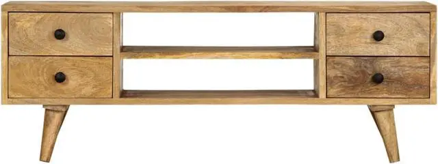 The TV cabinet is made of solid mango wood, which is stable, durable and beautiful. The craftsmanship and the beautiful wood grains make every piece of furniture unique and slightly different from the next. The 4 drawers and 2 open compartments provide ample space for you to keep DVD players, game consoles, streaming devices and media carriers neatly organized.